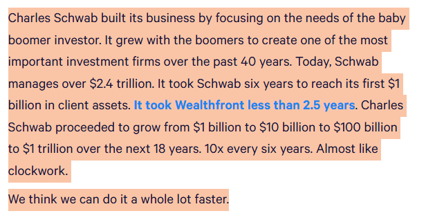 In a 2014 blog post titled “The $7 Trillion Opportunity,” Wealthfront argued it was growing at more than twice the rate Charles Schwab achieved in its early years: