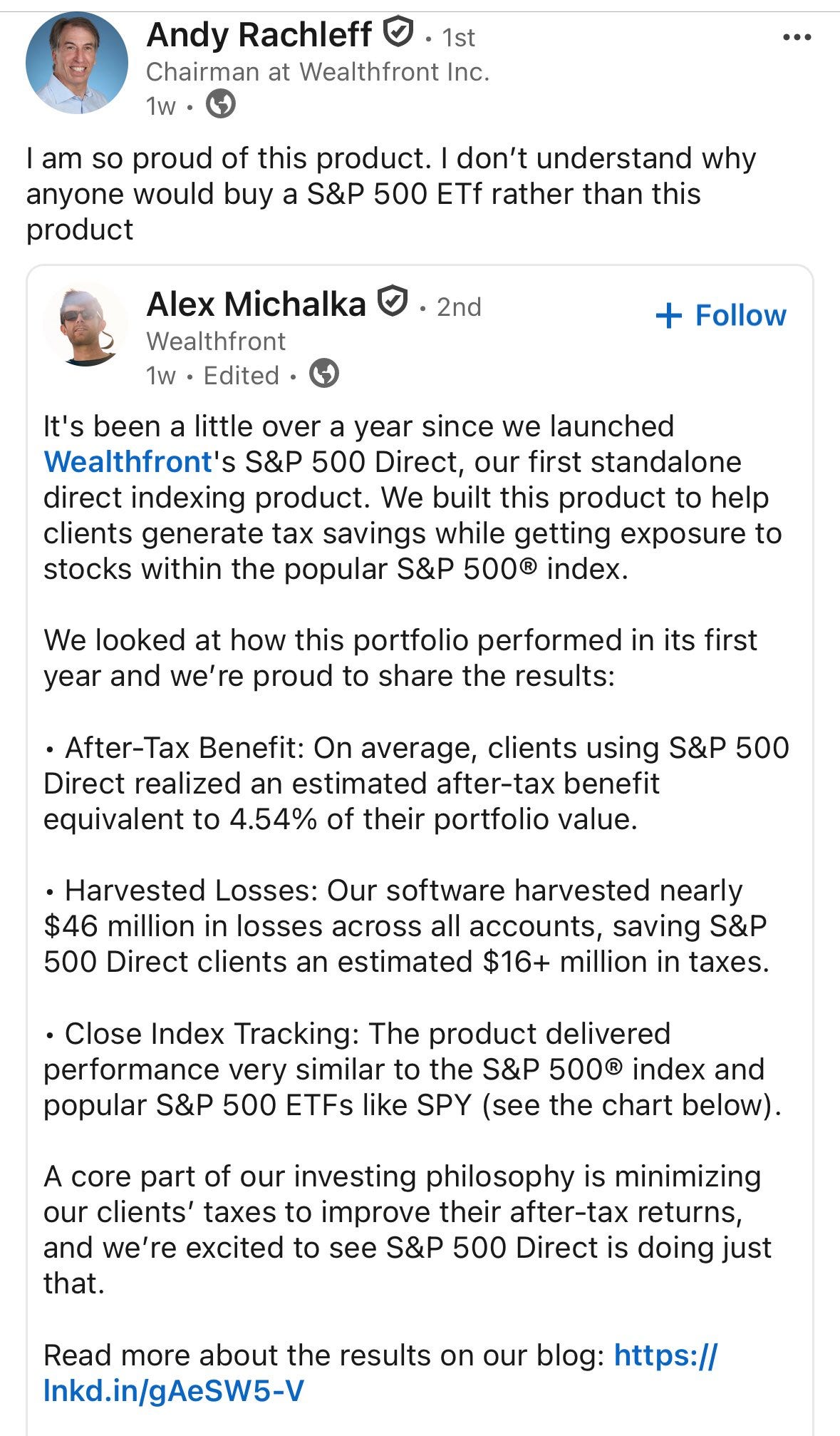 “Wealthfront’s Nasdaq-100 Direct is available for 12 basis points annual advisory fee, a fee lower than leading exchange-traded product offerings in the space with the added benefit of automated tax-loss harvesting. This product went from idea to launch in less than 8 weeks, highlighting the accelerating pace of product velocity exhibited by our talented engineering team.”