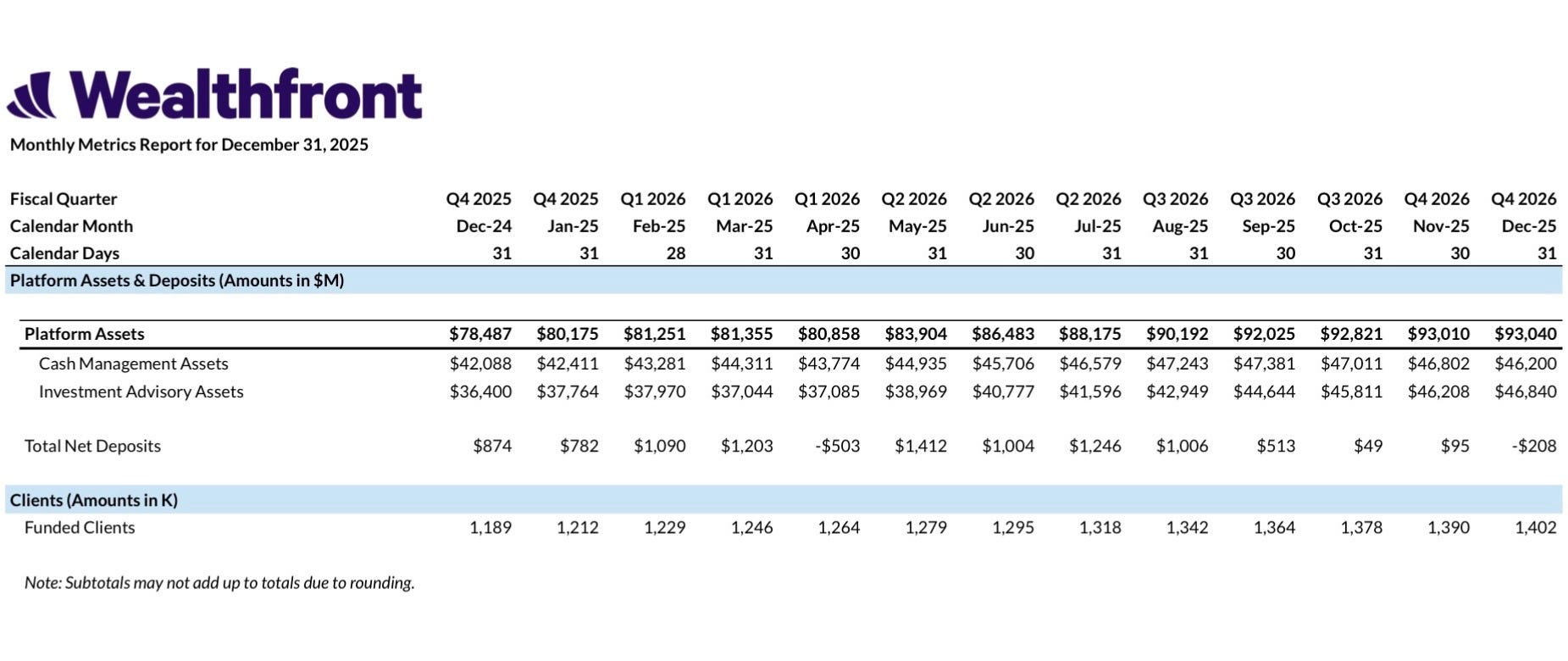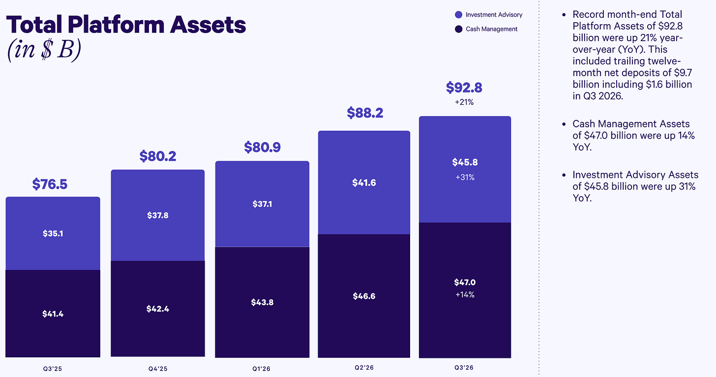Today, Wealthfront has only ~400 full-time employees and total platform assets of ~$93 billion across ~1.8 million customer accounts. Total platform assets are split down the middle between Cash and Investment Accounts.